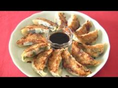 6. Heat olive oil in a frying pan, place gyoza, cook on high heat until the bottoms become brown. Turn down the heat to medium, add melted cheese water (5.), cover and steam the gyoza on high heat until the water is gone and cooked.