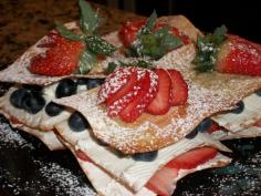 12 pieces of wonton skin, 1 cup of heavy cream, 1/2 cup of marscapone cheese, 1/2 tsp of vanila extracrt, 3 Tbs of sour cream, a pinch of salt, 2-3 Tbs of honey, 1/2 cup of strawberries, 1/2 cup of blueberries.