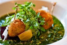 Savory Porridge with frog's legs, smoked beetroot, garlic, parsley, and fennel at Dinner by Heston Blumenthal in London. #wishlist