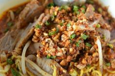 Tom yam boran, (Thai: ต้มยำโบราณ). Tom yam boran is noodles served in a thick spicy sour sauce or broth, with crushed dried chillies, chopped peanuts and blanched vegetables such as bean sprouts. This version is bami mu tom yam boran: with egg noodles and pork.