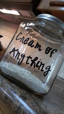 Cream of Anything Dry Soup Mix | 1 cup non-fat dried milk 3/4 cup cornstarch 1/4 cup bouillon - use whatever kind (ie, beef, veggie) 4 Tbs freeze dried minced onions 1 tsp dried basil 1 tsp dried thyme 1 tsp pepper Mix and store. To use mix 1/3 cup dry mix with 1 1/4 cup water for one can of soup. Cook until thick. Add bits as needed (ex - chopped mushrooms for cream of mushroom soup)