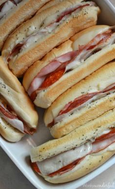 Hot Italian Sandwiches baked in the oven. Meaty Cheesy Sub Sandwiches, great for feeding a large crowd!