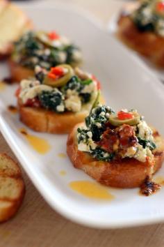 Warm feta and Spinach on golden baguette drizzled with chili oil. Use cashew cream in place of feta for a vegan version.