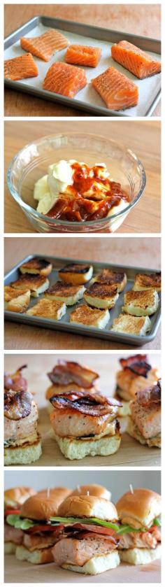 Salmon BLT Sliders with Chipotle Mayo - Loaded sliders with baked salmon and crisp bacon smothered in chipotle mayo, perfect for game day! turkey bacon of course!