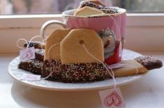 Eetbare theezakjes! Leuk idee van ze . nl Knip uit een vel wit papier een sjabloon in de vorm van een theezakje. Maak dan zanddeeg. nijd met behulp van de sjabloon de koekjes uit het deeg en leg deze op een ingevette bakplaat. Druk aan de bovenkant met een rietje een rondje voor het touwtje. Als ze klaar zijn, in gesmolten chocola dopen, evt spikkels erop en klaar is kees!
