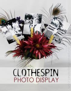 Here’s a simple way to add photos to centerpieces. Just glue some smaller clothespins onto dowels or thicker wood shish kabob skewers. You can paint them or leave them plain wood and even add some flourishes as shown. It’s a great way to personalize an arrangement!