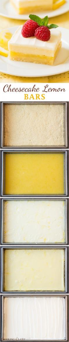 Cheesecake Lemon Bars - these are the ULTIMATE spring dessert! Lemon bars meets cheesecake. 4 layers of utter decadence and youre going to LOVE them!