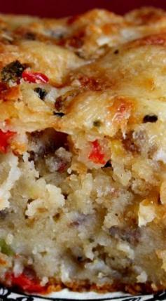 1 pound of hot bulk sausage 1/2 cup of chopped onions 1 cup of chopped red bell peppers 1 cup of chopped green bell peppers 1/4 cup of grated Parmesan cheese 1/2 cup of grated pepper jack cheese 1 egg, beaten 1/4 teaspoon of Tabasco 1 1/2 teaspoons of a combination of salt, black pepper and garlic powder 2 cups of biscuit mix 3/4 cup of milk 1/4 cup of sour cream http://elizabethsedibleexperience.blogspot.com/2009/08/helpful-husband.html