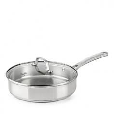 The Calphalon Classic Stainless Steel 3-qt. Sautà Pan is built to last with time saving features. It has etched fill lines that make measuring easy and a cover with straining holes that line up with pour spouts to drain liquids so you don't have to use a separate colander. The pan is made from brushed stainless steel with an impact-bonded aluminum base for fast, even heating, and is dishwasher safe for easy cleanup. The 3-qt. Sautà Pan has a wide, flat bottom to maximize the cooking surface, giving you room to sear steaks, chicken or fish. Straight sides keep juices in the pan and minimize splattering. This pan is also perfect for making deglazed pan sauces â€" the stainless steel cooking surface encourages browning, caramelizing juices on the bottom to create the basis for flavorful sauces. Color: Silver.