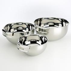 High-quality 18/10 stainless steel construction Integrated handles offer an easy grip Set includes 3 mixing bowls Dishwasher- and freezer-safe Rolled rims for mess-free and easy pouring Beautiful and stackable 5- 3- and 1-1/2-quart mixing bowls Large bowl measures 10 across 5 deep Medium bowl measures 8 across 4 1/2 deep Small bowl measures 6 1/2 across 3 3/4 deep.This All-Clad Stainless Mixing Bowl Set does creative things with mixing bowl design giving you more than just an ordinary mixing set. These highly polished 18/10 stainless steel bowls can do all the usual duties - mixing batters tossing salads incorporating ingredients into dough - but their details allow for other kinds of food prep too. Their integrated handles provide a sure secure grip and allow you to use the bowls as double boilers with the handle resting over the pan edge. Stackable for storage these All-Clad bowls are of the finest quality and come with a manufacturer's limited lifetime warranty. About All-CladFounded in 1971 in Canonsburg Pennsylvania All-Clad Metalcrafters produces the world's finest cookware in its Southwestern Pennsylvania rolling mill using the same revolutionary processes that they introduced forty years ago. Today All-Clad is the only bonded cookware that's handcrafted by American craftsmen using American-made metals. Originally founded to meet the highest standards of professional chefs All-Clad has become the premier choice of cookware enthusiasts of all experience levels from world-class chefs to passionate home cooks in everyday American kitchens. The unsurpassed quality and performance of All-Clad cookware is derived from its innovative roll bonding process which uses a proprietary recipe of metals. Cladding is applied not just to the bottom but also up the sides of each All-Clad cooking vessel providing outstanding heat distribution and reliable cooking results. All-Clad cookware is hand-inspected at every stage of the manufacturing process and is famous for the uncompromising quality that's evident in every detail from its impeccable balance in your hand to its meticulous hand-finishing.