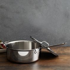 This All-Clad stainless-steel saute pan is wide and deep to provide ample room for food movement, with a flat bottom to slide smoothly back and forth on a burner. Straight sides provide the surface area necessary to sear or braise, with the durability of tri-ply construction to finish a dish in the oven or broiler. Lid circulates moisture and keeps in nutrients, cooking on a stove top or in the oven, and helper handle makes it easy to lift when full. The All-Clad saute pan allows cooking foods in a small amount of oil or butter while continuously tossing or stirring. This deep saute pan is also ideal to deglaze. The exceptional even-heating qualities of All-Clad cookware produces gourmet results. The All-Clad stainless-steel collection of cookware for ultimate cooking convenience features redesigned ergonomic handles and All-Clad brand and measurement/capacity on the underside of each pan for easy identification. High-strength, noncorrosive stainless-steel rivets secure handles permanently for safe cooking. All-Clads leading cookware line is brilliantly styled with a hand-polished gleaming stainless-steel finish that many of the worlds professional and home chefs prefer. The 18/10 stainless-steel interior will not react with food, leaving the pure taste you desire. Magnetic exterior is perfect for all cooktops, including induction. Oven- and broiler-safe. Dishwasher-safe. Lid and pan made in the USA.