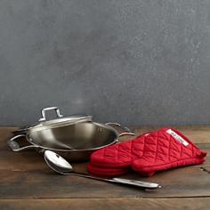 The All-Purpose Pan features a domed lid to hold in heat, moisture, flavors and valuable nutrients. Useful for saut ing onions, stir frying vegetables, searing fish and browning meats, the pan makes a versatile addition to any kitchen. The All-Purpose Pan includes oven mitts and a serving spoon for stovetop-to-table convenience of one-pan meals. - Brushed exterior Engraved capacity marking on the bottom of every pan Comfortable, oversized handles Easy-grip riveted loop handles provides stability Convenient rolled lip for easy pouring 18/10 stainless steel cooking surface will not react with food 2 quart capacity, Stainless spoon and 2 red mitts included Size: 14" x 10.5" x 2.25" Capacity: 2 QT. Weight: 4 lbs.