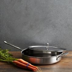 Saut, brown, and sear with the All-Clad D5 6-Quart Saut Pan. This classic pan's large surface area and tall, straight sides prevent splattering and allow for easy turning with a spatula. As with all cookware from All-Clad's D5 collection, this pan is constructed with bonded stainless steel for exceptional heating, especially in induction cooking. Its stick-resistant, 18/10 stainless steel interior and long, comfortable handle will make this an essential tool in your kitchen. It includes two riveted stainless steel handles and a lid. For Saut ing, Searing, Browning, and More Deeper than traditional fry pans, this saut pan has more surface area and tall, straight sides that hold in juices, prevent splattering, and allow for easy turning with a spatula. Ideal for a range of foods, the saut pan allows you to brown or sear, then deglaze or finish in liquid-all in one pan. This 2-quart pan has both a loop handle and a long handle, both made of cast stainless steel. The lid locks in moisture and heat to thoroughly finish meals on the stove or the oven. From All-Clad's D5 Brushed Stainless Steel Collection Cookware from the All-Clad D5 collection feature bonded five-ply construction with alternating layers of stainless steel and aluminum. This layered construction eliminates warping and enables even heating. And with 18/10 stainless steel interiors, D5 cookware is stick-resistant and non-reactive to food. Pieces from this collection feature attractive brushed stainless steel exteriors that complement many kitchen styles. Compatible with a Range of Cooking Surfaces All D5 products are optimized for induction cooking, but also perform well on all stove ranges, in the oven, or under the broiler. The pieces are also dishwasher safe for easy, convenient cleaning.