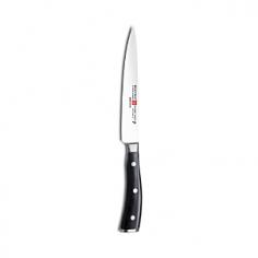 Blade is forged from high-carbon stainless steel. Triple-riveted black handle with comfortable grip. Double bolsters provide heft and balance. Hand-washing is recommended. Blade measures 6 inches long. Use the Wusthof 4506-7/16 Classic Ikon 6-inch Utility Knife for a variety of cutting duties. Its high carbon stainless steel blade offers a keen edge that holds its sharpness. A black poly handle is triple-riveted for a balanced grip that feels good in the hand. Its blade design makes it a versatile addition to your cutlery collection. About WusthofSince their humble beginnings in 1814, the Wusthof family business has adhered to the same basic set of principles regarding their products. Their Trident logo is a representation of these principles, a symbol of form, function, and uncompromising quality. Today, Wusthof stands firm behind a strong line of products, including an assortment of more than 350 forged knives, as well as cutting boards, knife blocks, kitchen tools, and scissors, all of which are produced by dedicated workers at state-of-the-art facilities in Solingen, Germany.