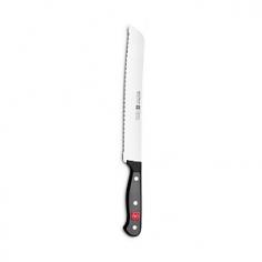 There's absolutely no substitute for a quality bread knife to get uniform, presentable slices. ; The long, serrated edge makes cutting crust easy and leaves the tender interior intact. ; Using state-of-the-art laser technology, the GOURMET series is precisely cut from one piece of steel. ; The special steel alloy that comprises the blade assures that it is exceptionally sharp and has a long-lasting, easily restorable edge. ; Full tang construction from the blade through the back of the handle for a solid feel and confident control. ; Riveted synthetic handle with finger guard is smooth and seamless for a comfortable grip. ; The specially designed handle acts as a bolster for balance and guards the finger for safety. ; Carefully hand wash and towel dry. ; Blade length: 9.0 Blade width: 1.0 Handle length: 5.0 Weight: 5.0 oz. ; Made in Germany.