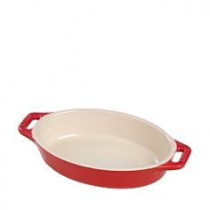 Ramekins & Ceramic Bakeware - Standing tough against thermal changes and impact, the 9" Staub Oval Dish is beautifully crafted of 100% ecological ceramic with a porcelain glazed finish. PTFE- and PFOA-free, the Staub baking dish evenly distributes and holds heat for your meats, vegetables, pasta dishes and desserts. Ceramic baking dish is microwave- and oven-safe to 572 F, broiler-safe and freezer-safe. Secure-grip loop ergonomic handles make carrying easy for beautiful oven-to-table presentation. Dishwasher safe, but hand washing recommended.A benchmark for artisan quality and durability, Staub is the preferred bakeware of choice, used in restaurants around the world. Product Features Crafted of 100% ecological ceramic and porcelain glazed finish Thermal shock and impact-resistant Tolerates temperature fluctuations from freezer to oven or microwave to table Fine polished base will not scratch surfaces Secure-grip loop ergonomic handles make carrying easy PTFE- and PFOA-free Microwave- and oven-safe to - Specifications Material: ceramic, porcelain glazed finish Model: 40511-156 (cherry), 40511-157 (dark blue), 40511-158 (white) Capacity: 1 qt. / .95 L Size: 9"L (11" with handles) x 6"W x 2"H Weight: 2 lb. Made in China Use and Care Microwave- and oven-safe to 572 F and broiler-safe. Freezer-safe. Dishwasher-safe, but hand washing recommended.