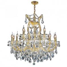 This stunning 19-light Crystal Chandelier only uses the best quality material and workmanship ensuring a beautiful heirloom quality piece. Featuring a radiant gold finish and finely cut premium grade clear crystals with a lead content of 30%, this elegant chandelier will give any room sparkle and glamour. Worldwide Lighting Corporation is a privately owned manufacturer of high quality crystal chandeliers, pendants, surface mounts, sconces and custom decorative lighting products for the residential, hospitality and commercial building markets. Our high quality crystals meet all standards of perfection, possessing lead oxide of 30% that is above industry standards and can be seen in prestigious homes, hotels, restaurants, casinos, and churches across the country. Our mission is to enhance your lighting needs with exceptional quality fixtures at a reasonable price. Finish: Polished Gold Crystal Color: Clear 30% Premium Full Lead Double-cut Crystal (19) 60W E12 Incandescent Candelabra Bulb(s) Bulb(s) Not Included Total Watts: 1140 Voltage: 110V - 120V Number of Tiers: 2 Beautiful Polished Gold finish and dressed with precision cut and polished 30% Full Lead Crystals for maximum brilliance and sparkle From the Maria Theresa Collection Accommodates up to 19 60-watt maximum (40-watt recommended) candelabra base incandescent E-12 bulb (not included) Solid Brass Frame in Gold Plated Finish and 30% Full Lead Crystal Includes 72-in adjustable chain for hanging Includes Double Cut Crystal embellishments where relief is repeated on both sides of left prisms for more reflection / refraction of light UL and CUL Listed to US and Canadian safety standards For Dry Locations only (Dry Locations include kitchens, living rooms, dining rooms, bedrooms, foyers, hallways and most areas in bathrooms) Hardware included Assembly instructions and template enclosed for convenient setup (Professional installation is recommended) 1 Year Limited Manufacturing Defects Warranty Hardwired UL Listed, cUL Listed, CSA Listed Style: Traditional Part of the Maria Theresa Collection Warranty Info: 1 Year, Worldwide Lighting Corporation warranties products to be free from defects for a period of one year following shipment. Warranty is and void if merchandise is not installed according to factory instructions, NEC guidelines, and applicable building cOverall Dimensions: 30"(D) x 30"(W) x 28"(H)Diameter Range: Diameter from 24" to 42"Item Weight: 90 lbs. Please note that this product is designed for use in the United States only (110 volt wiring), and may not work properly outside of the United States. Truck Freight Delivery. This item is too large or heavy to ship via standard UPS or FedEx ground. As a result, it will be shipped via Truck Freight. Once your shipment is within your local area, you will be contacted by the Truck Freight carrier to schedule a delivery appointment. This is usually a 2-4 hour window during business hours, but will be determined based on your availability. You will be responsible for taking it off of the back of the truck, so please be prepared move the unit into its final destination. Most truck freight carriers offer upgraded services for inside delivery. This is not something that we offer at this time and you will need to arrange that directly with the truck freight carrier when they schedule your appointment*Use of this product will expose you to lead, a chemical known to the State of California to cause birth defects or other reproductive harm. Not intended for food use.